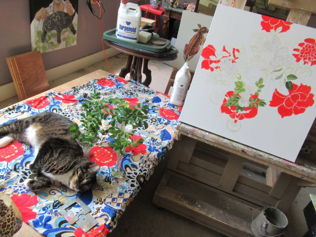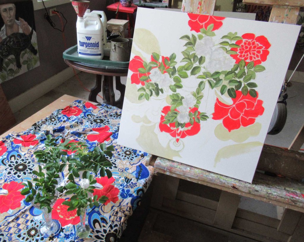 I must admit that after painting green landscapes lately, the bright red floral patterns were a welcome relief! Here’s how it looked at the end of the day.