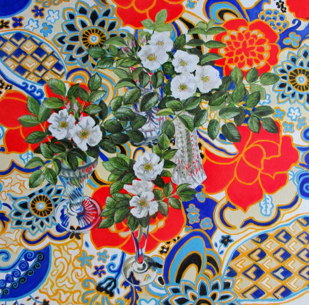 The roses are from my garden — and I had to paint fast. They’re at the end of their blooming cycle. And what’s left is falling prey to the greedy Japanese beetles. The blooms are rather simple; it’s the beautiful leaves that I’m most attracted to.