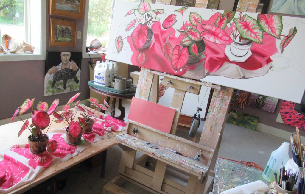 As long as they’re not on my face, I love folds & wrinkles! Alas, I grew weary of painting caladium leaves and jumped into the wrinkles this afternoon. And where is the cat, you may have wondered. Mr. Wonderful snuck into the studio this morning and of course had found “the perfect spot”, right on my setup. I carried him into the house, gave him some treats and he hasn’t complained since.