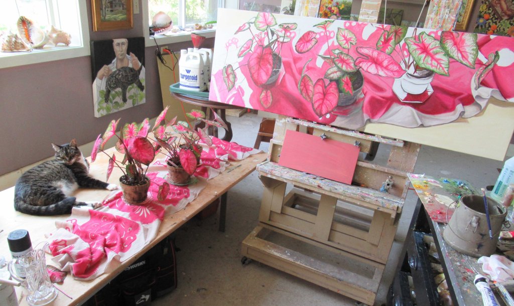 Mostly what I worked on were the fabric folds on the right side. Part of the battle was to keep the cat off the setup. I couldn’t tell you how many times I had to set my brush down and shake out a handful of cat treats for him. Yeah, he’s got a hard life. Slowly making headway on this thing.