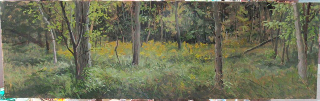 Day 4 on this one. The sky had been red this morning, so I was surprised I was able to get out and paint this morning. That old “red sky in the morning – sailors take warning” saying. Long about 9:30 the sun came over the hill and shone on the scene I was trying to paint. I try to work fast as possible, but after about just one hour, the light is totally different. So I have to quit.