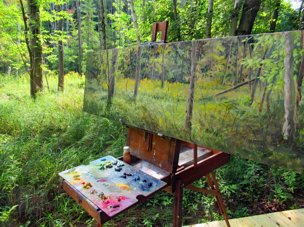 I spent the past 4 or 5 mornings out in my swamp, painting this view of goldenrods. The sun would rise over the hill about 9:30 and by 10:30 it would look totally different. This is an unusual size — 14×46&1/2″, but I had a frame this size in the back room. So why not? Thankfully, the mosquitoes weren’t bad. It’s the end of August, so maybe they’re done trying to torture us. This morning we had several bouts of light sprinkles. Not enough to stop me, though.