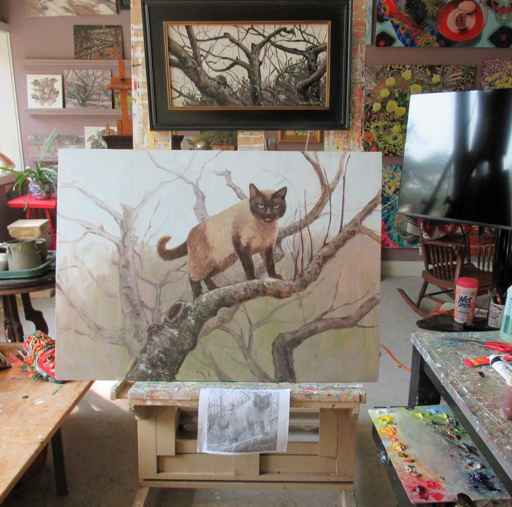 Sad news: my sweet Siamese, Bernie, has been missing for almost a week. I think he just got into the wrong spot at the wrong time. I’m painting a memorial piece for him, using a photo I’d shot this past spring. He was up in the apple tree, clowning around for me.