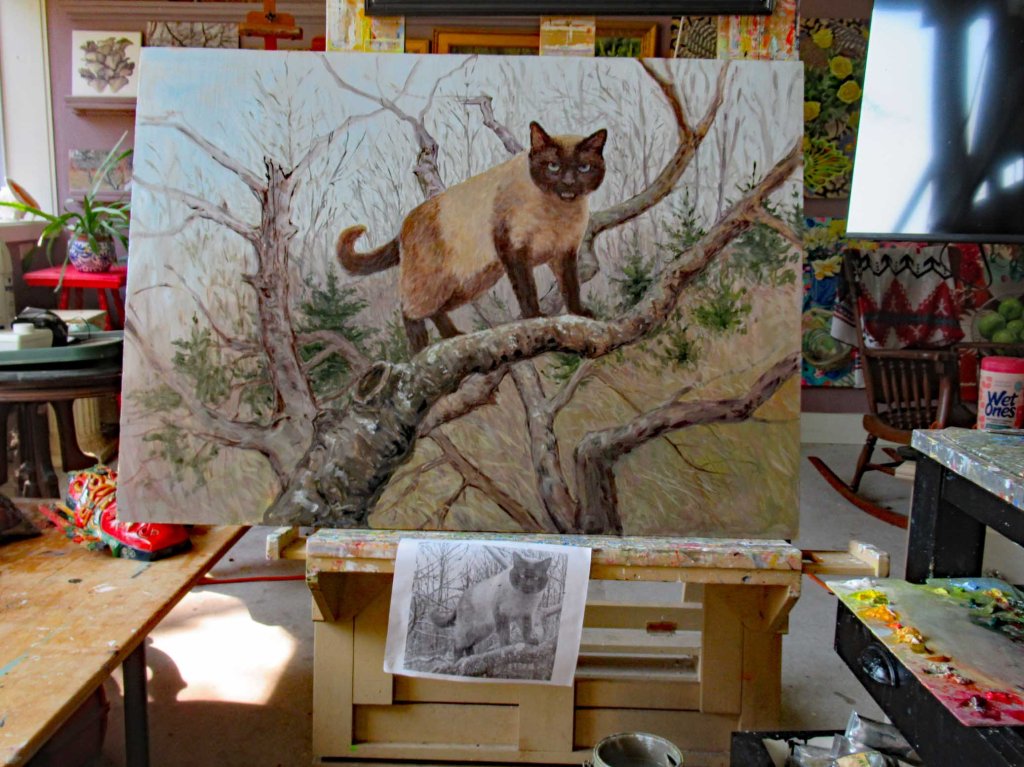 Working on a painting of my dearly-beloved Siamese, Bernie. He disappeared about a week ago. Today I worked on figuring out background details. Not done yet, of course. I added some spruce in the background and will keep plugging on it tomorrow.