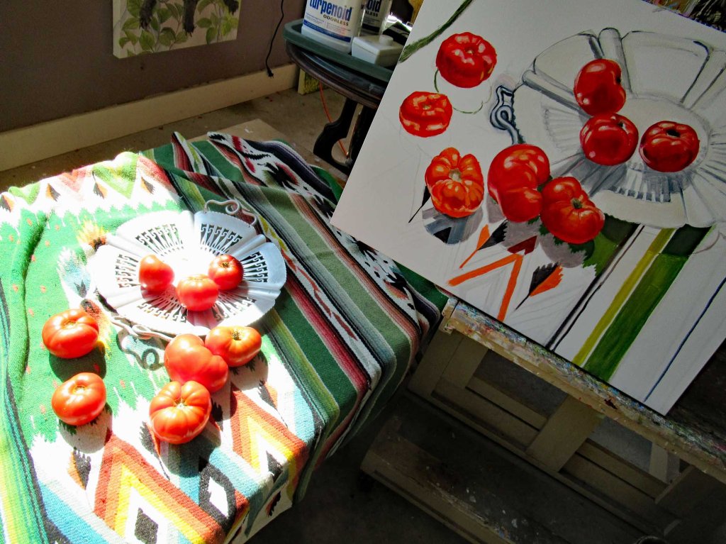 I started this yesterday, hoping to paint those tomatoes in as quickly as possible. They’d taken forever to ripen. Then all of a sudden — BLAMO! That’s a favorite hand-woven blanket I thought would make it interesting. And the vintage aluminum tray is quite a challenge. I’ve had to sit to work on this. Fell almost a month ago and my back & legs are still barking. Well, if it wasn’t for this painting, I’d be struggling to do yardwork. Out in the blazing sun…..