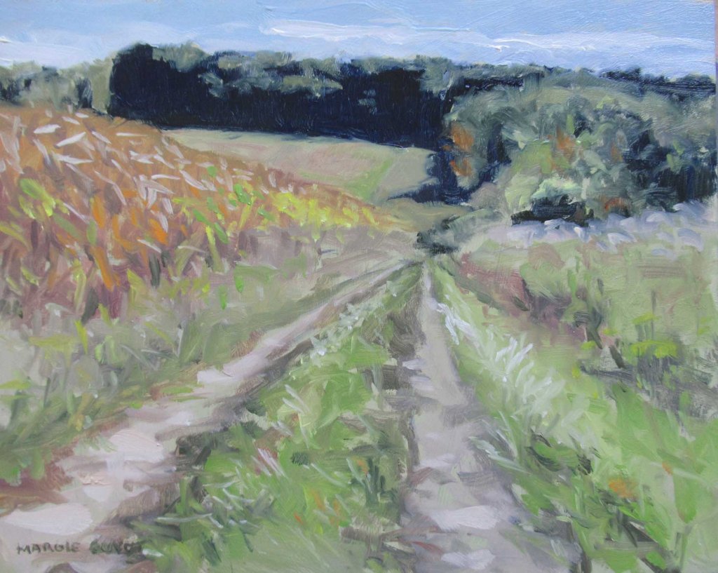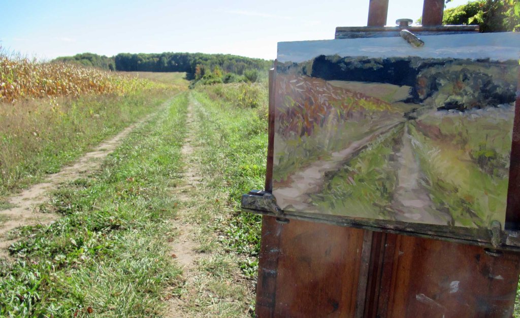 Another beautiful day here in northern Michigan. After doing laundry and tinkering with a couple still lifes, I couldn’t put it off any longer. Had to get out and paint something. This view is right off of the corner of M88 and Church Road. I’ve painted this view before — in winter. As I painted, murmurations of birds kept swirling by. Too bad I can’t shoot video!