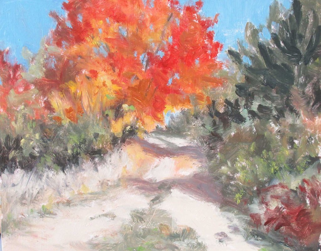 I usually shy away from painting screaming-red maple trees in the fall. Why is that, you ask? Years ago a teacher once lectured our class about how awful it was to paint “those nasty reds and oranges! Right out of the tube! Nay, NAY!” But today I felt rebellious. I was going to face those shameless colors once and for all! I had to step away from my “tree root painting” for a day anyway. There are only so many days of tree root-painting a person can take. We’d just gotten over a number of gloomy, rainy days and the sun was out. I was ready to rip! Red maples! Blue sky! But ach — it was chilly. I tried to block the stiff breeze with my car but it didn’t help. This spot is in a quirky campground on US 31, north of Eastport. All my brushes were super-frayed-out, but I plowed ahead anyway. What the heck. Some days are like that….