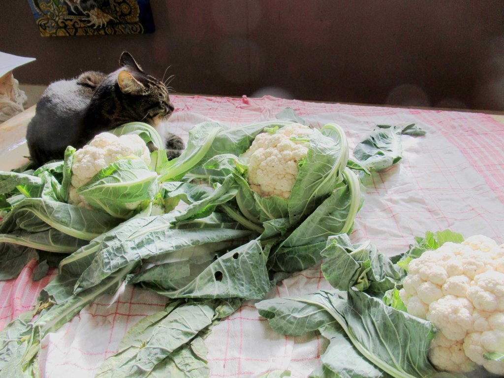 I’d been prowling the farmers’ markets for Indian corn when I happened to see a big crate of cauliflowers. All the leaves had been left on. Quite an amazing sight for someone who’s only seen the carefully-trimmed, plastic-wrapped ones in the grocery stores. They made me gasp. Definitely a sign I had to paint them! I call it the “wow factor”. It applies to landscapes, too.