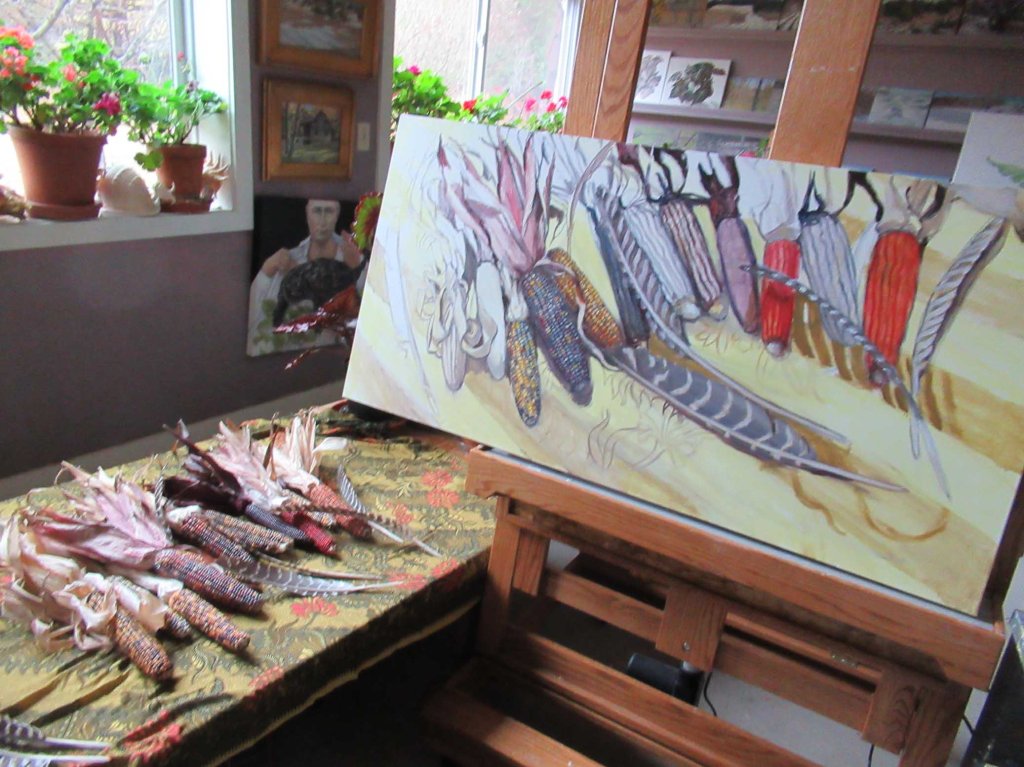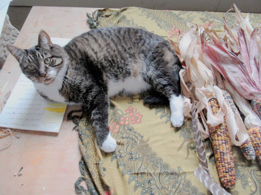 After several days of struggling with the drawing, I decided to dive in and start painting some of the corn kernels. One of my friends said she thought painting the kernels would be the hardest. Actually, no — it’s getting the composition right that gave me trouble. That, plus trying to nail down ever-changing rearrangements by the cats. Oh well — we’ve got some chilly, rainy weather here for a few days, so I’m happy to have an indoor project.