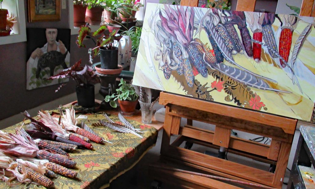 The corn – and all its glorious kernels — is pretty much done, more or less. I started working on the fabric this afternoon. Let me tell ya — never again will I complain about painting corn again! For some reason the fabric was a challenge. And I don’t know why. I’d used it in a painting this spring: