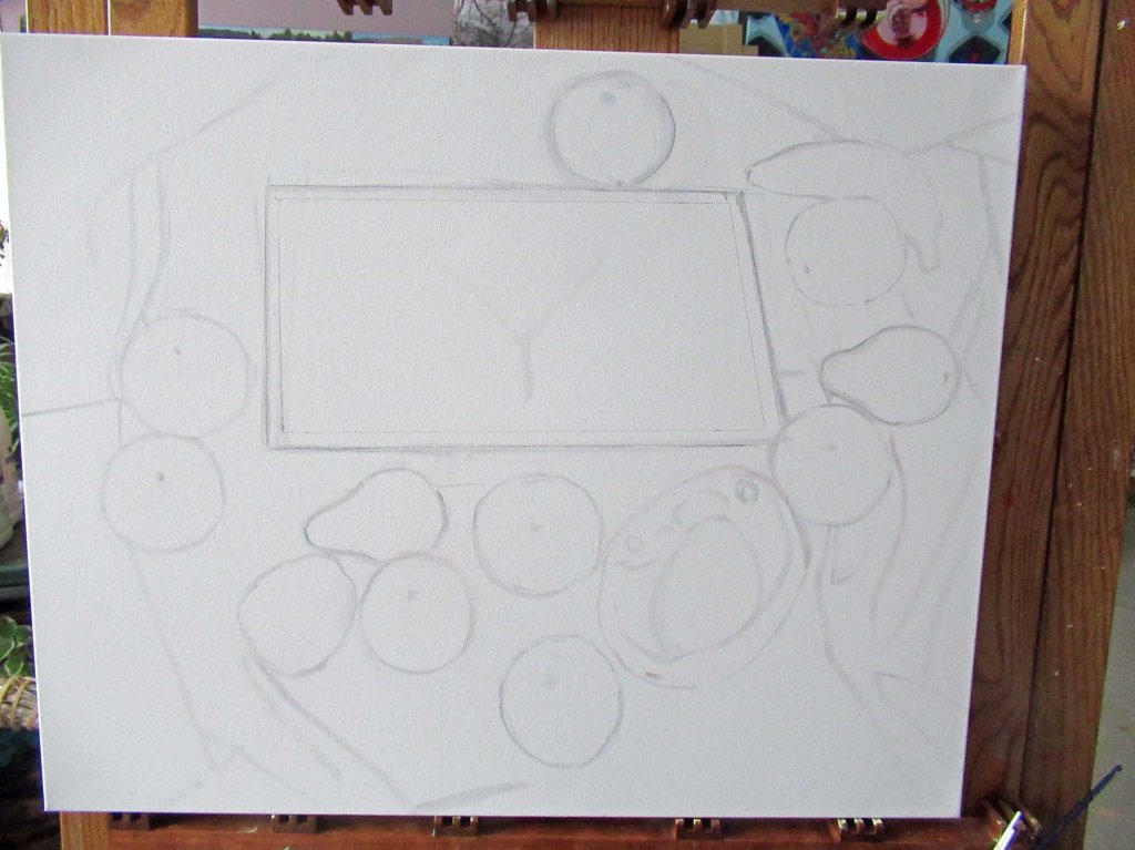 Here’s how it looks so far. Drawing it in is always critical. When I first started painting still lifes, I sometimes would end up with objects falling off the canvas. I’ake a good look through my little view finder when setting up the composition, then pick out an object that is more-or-less in the center, then carefully size everything else in relation to that.