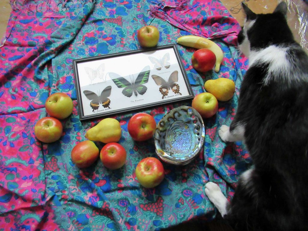 There’s always a touch of anxiety whenever I finish a painting: what should I paint next? I woke up in the middle of the night, seeing this setup. I was definitely in the mood to paint something wild. Something different! Not the same old, “safe” setup. I even knew the fabric to use. So, after putting the last few tweaks onto the last apples painting, I set up this arrangement. Picasso, my #1 favorite cat, had to investigate things, of course.