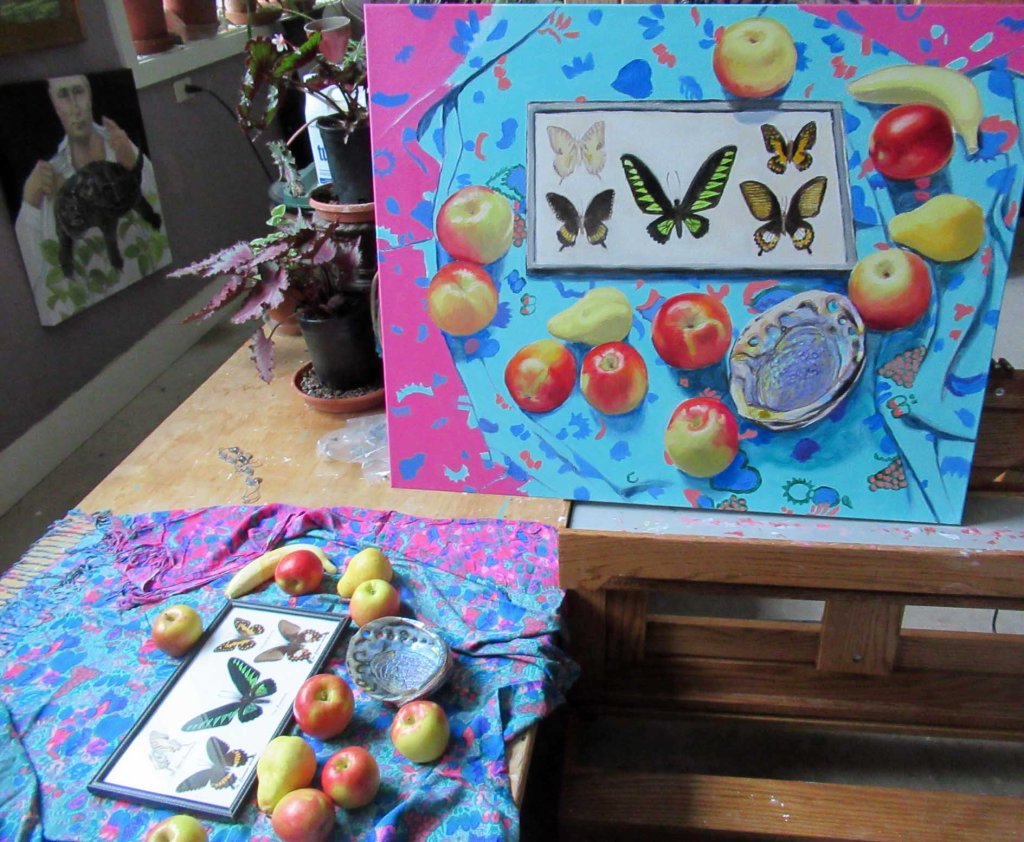 I had to take off painting yesterday and let this dry a bit before adding the details. Once again, I find myself wondering why the heck I picked this fabric! It’s another crazy-maker. Guess I’m addicted to struggles. The one thing I really loved to paint? The abalone shell. The colors –lavenders, turquoises, pale blues, golds, rusts, yellows — like a kind of circuss! Maybe someday I’ll do a big painting full of nothing but abalone shells. Which would go over big, up here in northern Michigan. Ha ha. Maybe I should live on a tropical island, where I could pick up all kinds of cool shells. As it is, I have to rely on snagging them at estate sales.