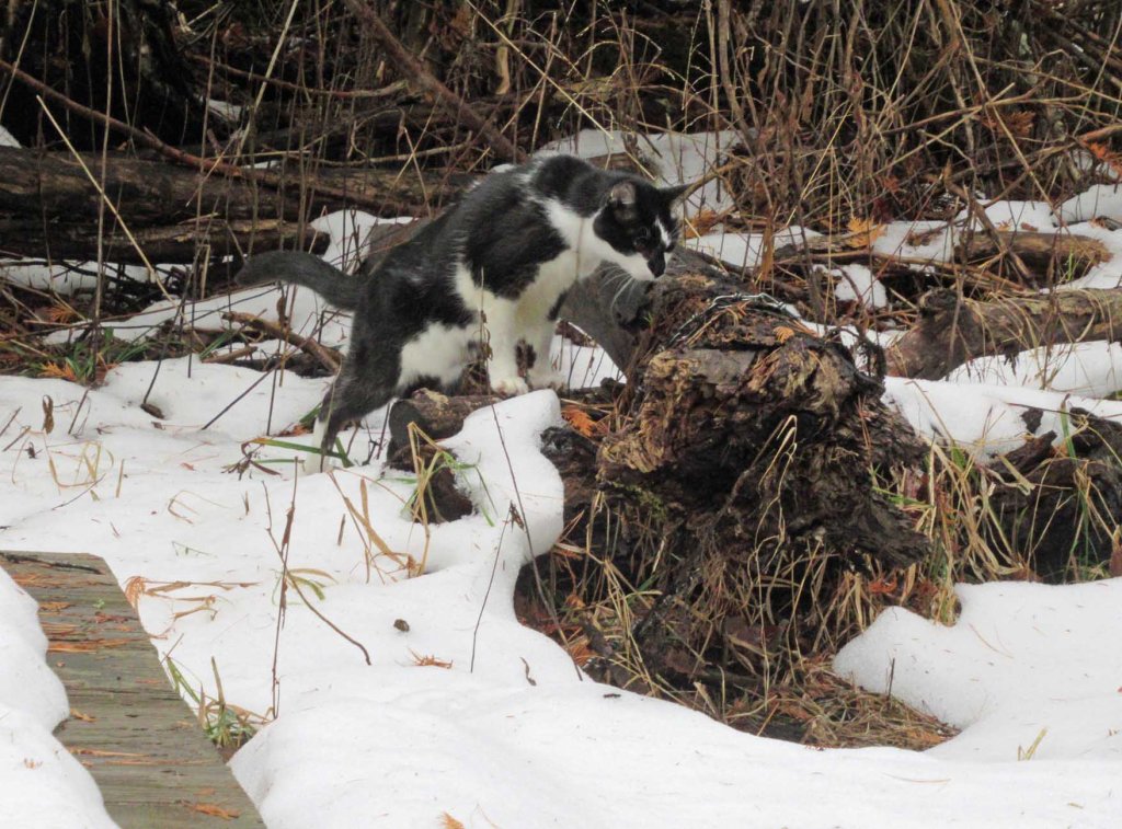 My eyes were getting crossed at one point, so I took a brief stroll down to the swamp. My dear Picasso followed, checking out all the tantalizing smells. Here he is, investigating the situation on the other side of the creek. After that, he was happy to return to his little observation basket in the studio.