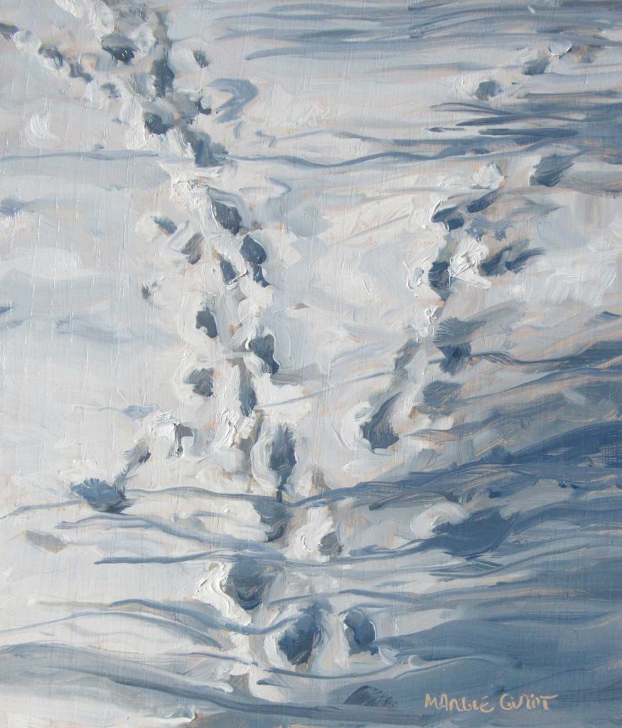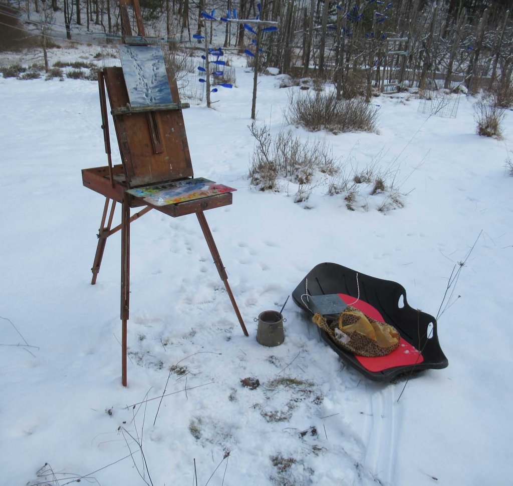 The sun surprised us all and made a rare appearance today. I’d been eyeing patterns of deer tracks here for weeks. Finally loaded up my sled with gear and went out into my yard to try painting. Didn’t know if it would turn out, but it was a fantastic challenge! Here’s my setup: