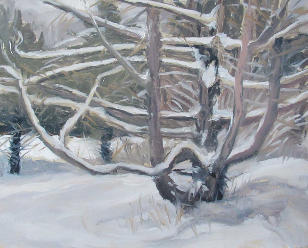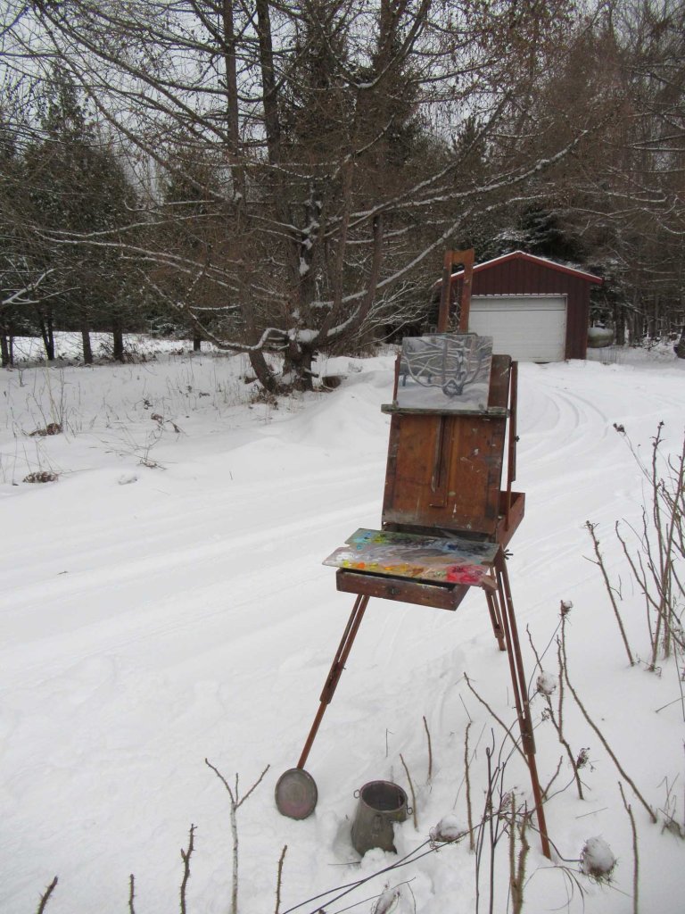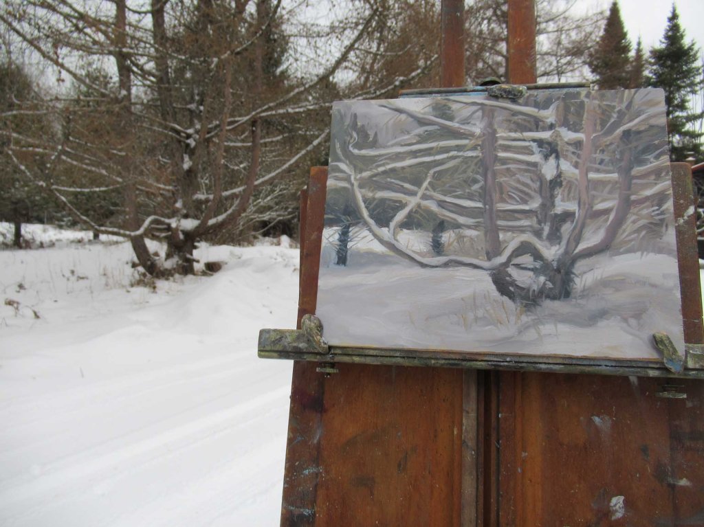 My driveway’s lined with tamaracks. They’re odd trees, growing in strange shapes, with crazy branches that seem to go where they want. In the fall their needles go from green to a deep, yummy caramel color — and then drop to the ground. This particular tree has had limbs blown off by storms over the years. I’d looked at it many times, meaning to paint it. Yesterday I loaded my gear onto my trusty, plastic sled and set up along the edge of the driveway, leaving room for an expected FedEx truck to pass. Of course FedEx cancelled out (as usual).