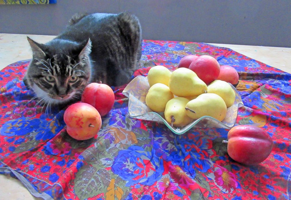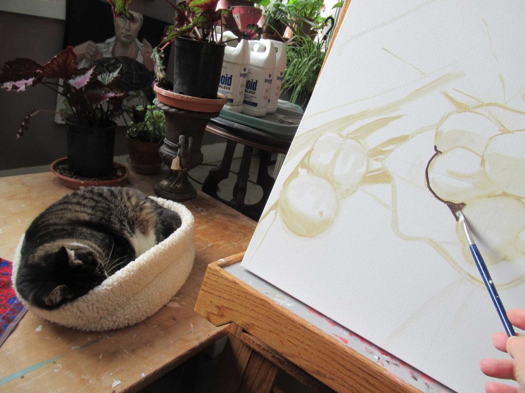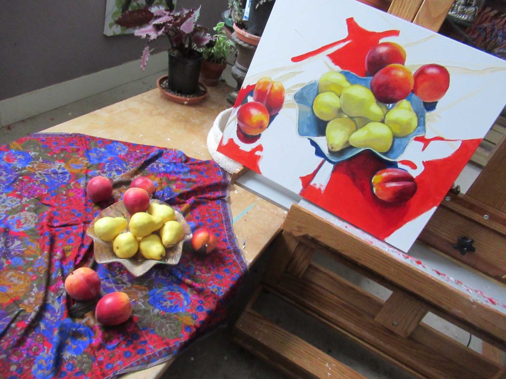 There are only so many days that I can stand to paint dark, gloomy, winter swamps! Thank goodness for plastic pears & peaches! And wild, garish colors! This is the end of Day 1.