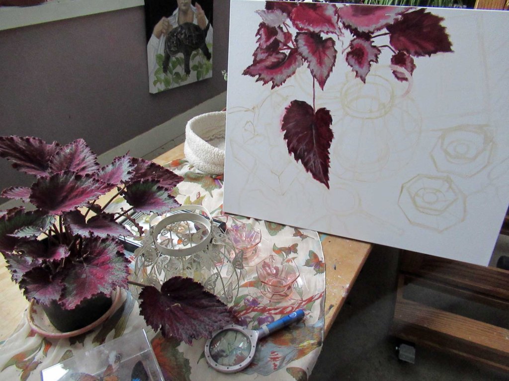 My friend Lucy goes south every winter and lets me babysit some of her plants. I think this begonia is exquisite! Wanted to step away from the plastic fruit for a while. I wanted to try to get the leaves painted ASAP because they’ll be moving slightly every day, twisting toward the window (dark & gloomy as it is here).