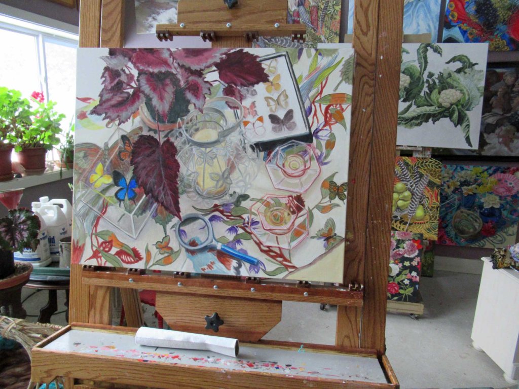 I didn’t attempt to go anywhere at all today. Too much snow. A good day to stay home and continue working on this one. Kind of challenging, but I think I’ll figure it out. I’d work on one spot until it got “too hard”, then move on to another spot. That’s the way I did algebra tests back in school. Flip around & do a problem, flip around until I spotted one I thought I could do next. Painting’s like that — for me, at least.