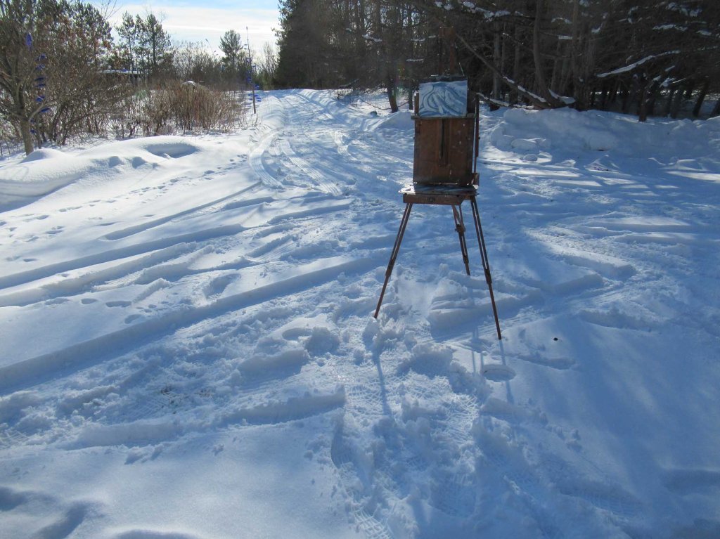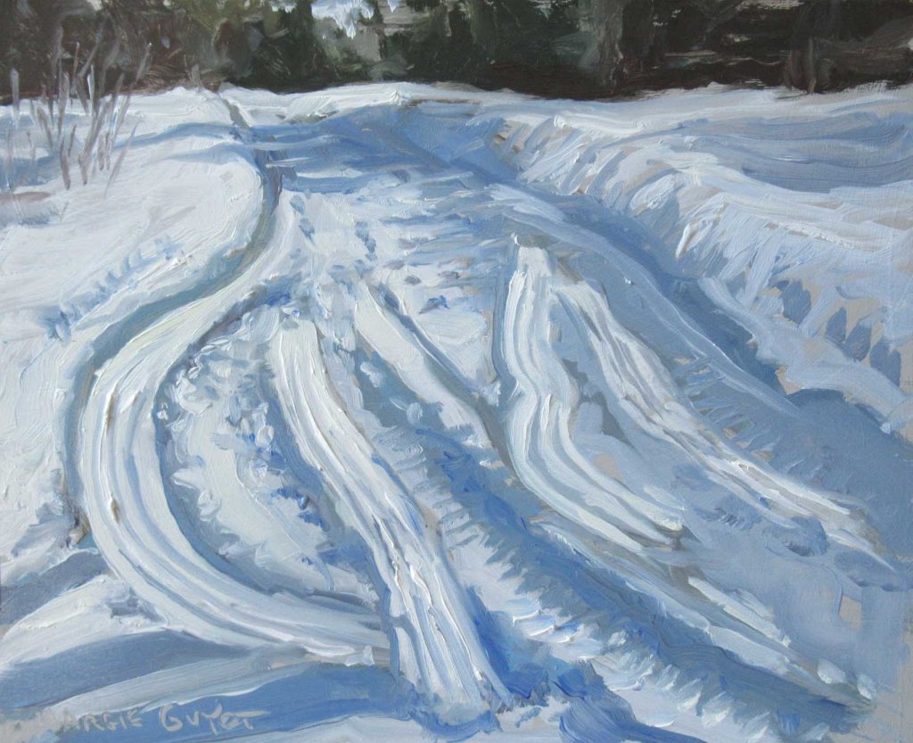 The sun FINALLY shone on us today and I was looking around for something interesting to paint. This view of my driveway caught my eye — a big LP delivery truck had just stopped by earlier, leaving the most impressive tracks. I loved the blinding glare of the sun on the tire tracks. I had to paint as fast as possible — it’s surprising how fast the sun moves and everything changes. And just try painting thin tire treads with a frayed-out #4 flat brush! But you get the idea. Normally my plow guy is johnny-on-the-spot, but his truck had been on the fritz. Fortunately, my car has 4WD, so I usually can claw my way out.