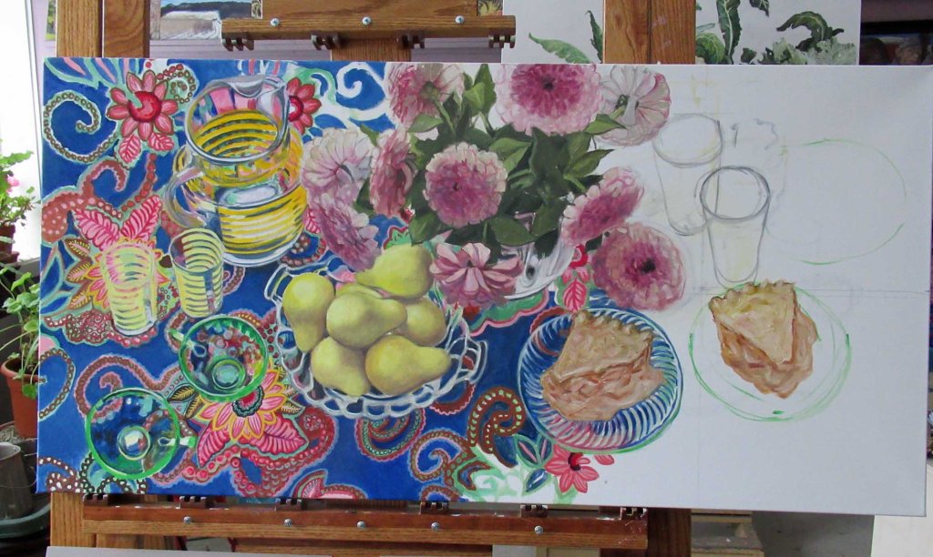 We’re all snowbound today, thanks to yesterday’s generous 5″ snowfall. I parked out in the studio all day, working on that crazy fabric and wondering what to put in the lower right. Then it hit me: pie, of course! Over the years I’ve painted dozens of slices of pie. All flavors, all angles. I come from a family of big pie-eaters. I’m an excellent pie-baker, too, so I know pies. I can paint them totally from memory. Have to. No more pies for me (boo-hoo): I’ve been doing keto for about 3 years. Sugar is kaput!