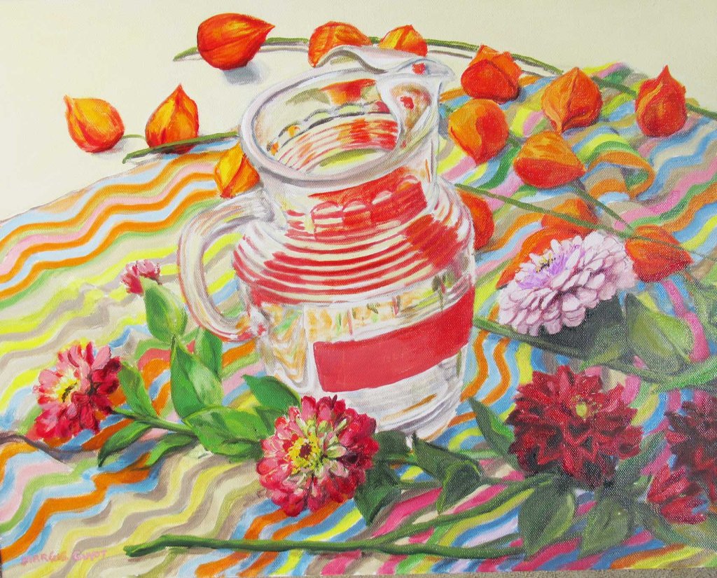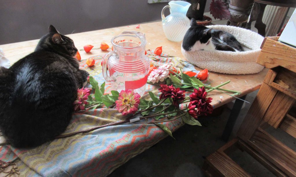 I titled this one “October Bouquet” because the flowers I used are typically blooming here in early October: zinnias, dahlias and Chinese Lanterns. Of course I used silk flowers (it IS February). It’s been so cold and snowy here, I’ve been doing lots of still lifes. And I always try to use a lot of color. Happy to be finished with this one — those stripes were driving me mad! And it didn’t help one bit to have both cats rearranging things all the time! Here are Mr. Wonderful and Picasso.