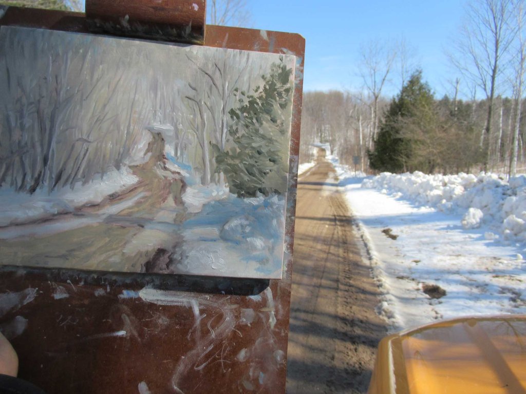 Not much to this road. A private drive heads to a residence at the top of the ridge. And a seasonal road veers off to the left, winding along the side of the road through a beautiful woods. Seasonal roads are not plowed in the winter, so it’s impossible to get through. After I finished painting this, I stepped outside and held the painting up for the photo:
