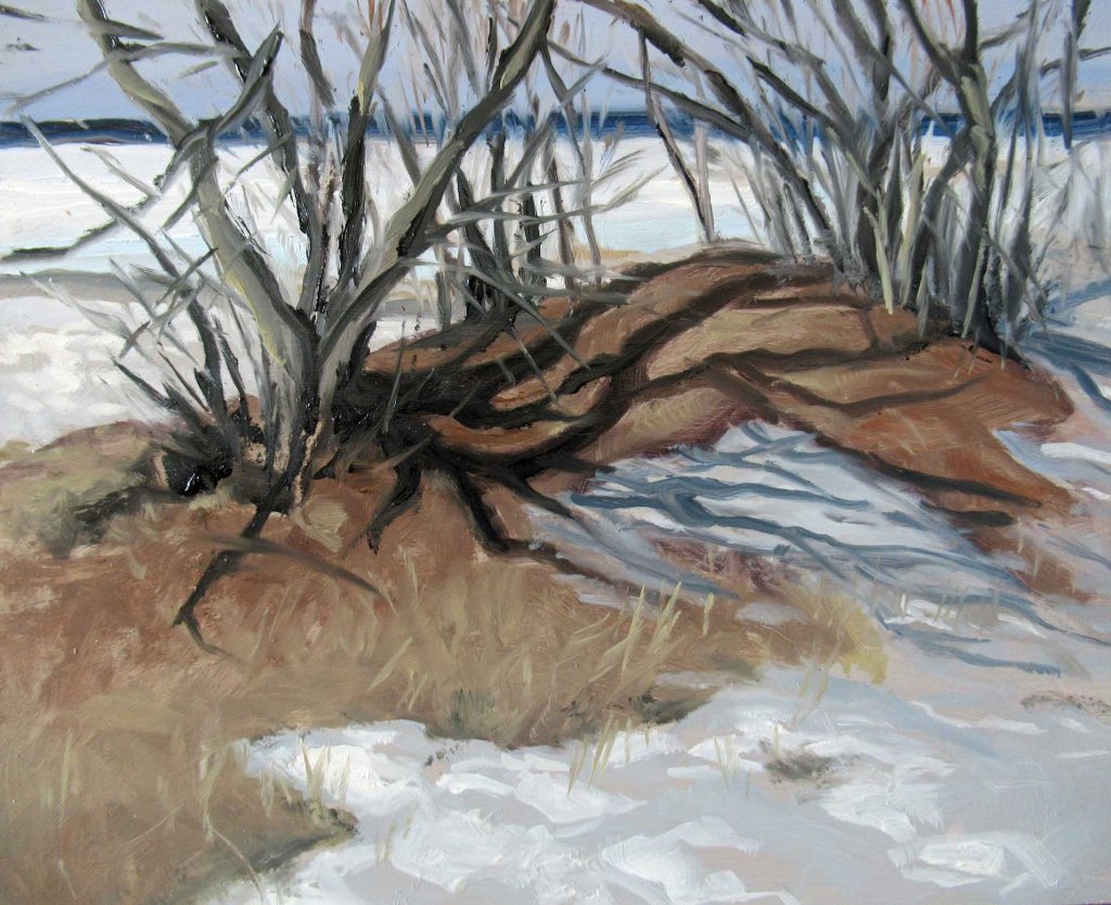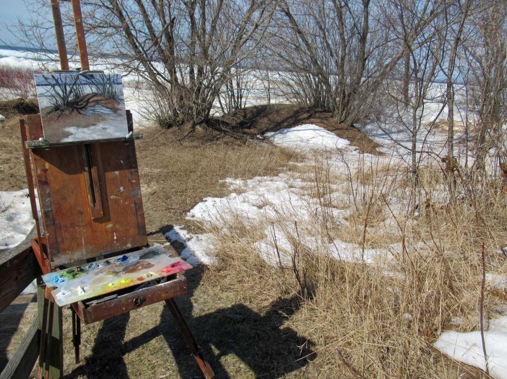 I’d originally planned on painting a view of the ice pileup along Lake Michigan, but couldn’t find any views I liked. All the good stuff was “way out there” — too far to safely walk out that far. And walking in the snow is still kind of tricky! Instead, what caught my eye was this clump of trees in Norwood Park. I loved the way the shadows fell across the snowbank. Kind of tricky to paint: I had to paint in the background before tackling the trees. Had to try to remember to paint it thinly so I could paint the darker trees over. You can see how far out the ice was. Yes, I wasn’t sure how this would come out, but I think it turned out pretty fine.
