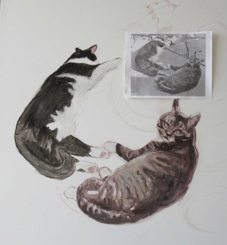 I try to avoid working from photos, but it’s a necessity when trying to paint cats. This is what I got so far: