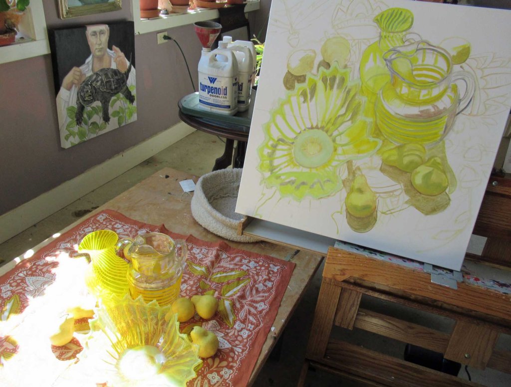 Finally – a rare, bright, sunny day here! I found a pretty bandana in shades of yellow and soft rusty-brown at a resale shop yesterday and paired it with my good-old plastic pears and a few other yellow things. I worked like crazy today to get the basics drawn in. Then I concentrated on laying in the shadows. We’re headed for several days of dark, rainy weather – plus a possile ice storm — but at least I’ll know I’ve got the shadow patterns established.