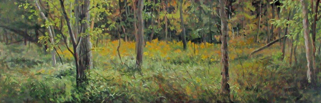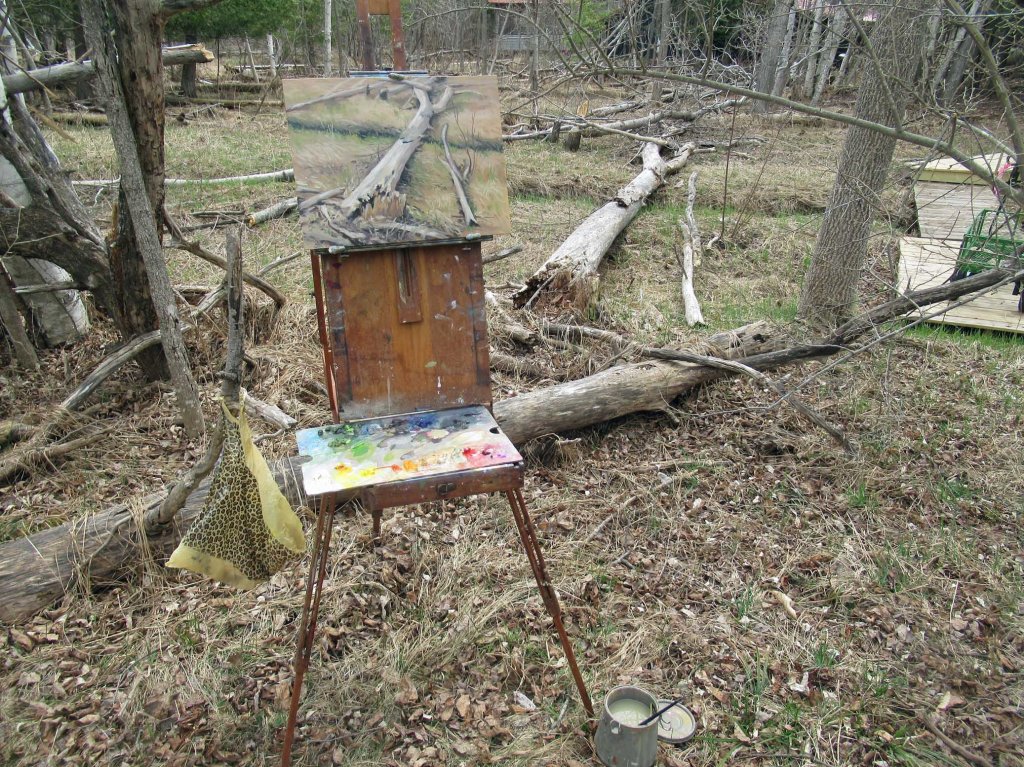 Here it is, late April, and we have a semi-nice day. The infamous ice storm has melted and flowers are starting to peek out. Here’s my setup along Guyer Creek, looking south at a huge tree that fell last August. I remember that day well. I’d been on the other side of the creek, doing a rather large painting of the morning sun as it rose over the swamp. I’d gone out there every morning at 9:30 to catch the light. Then one morning — BOOM!!!! — this very tree collapsed not 10 feet away from where I was standing! Here’s the painting: