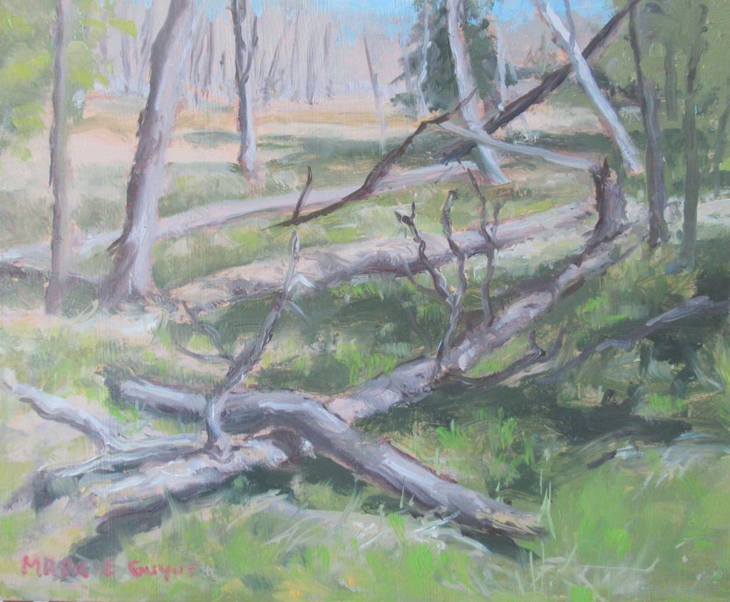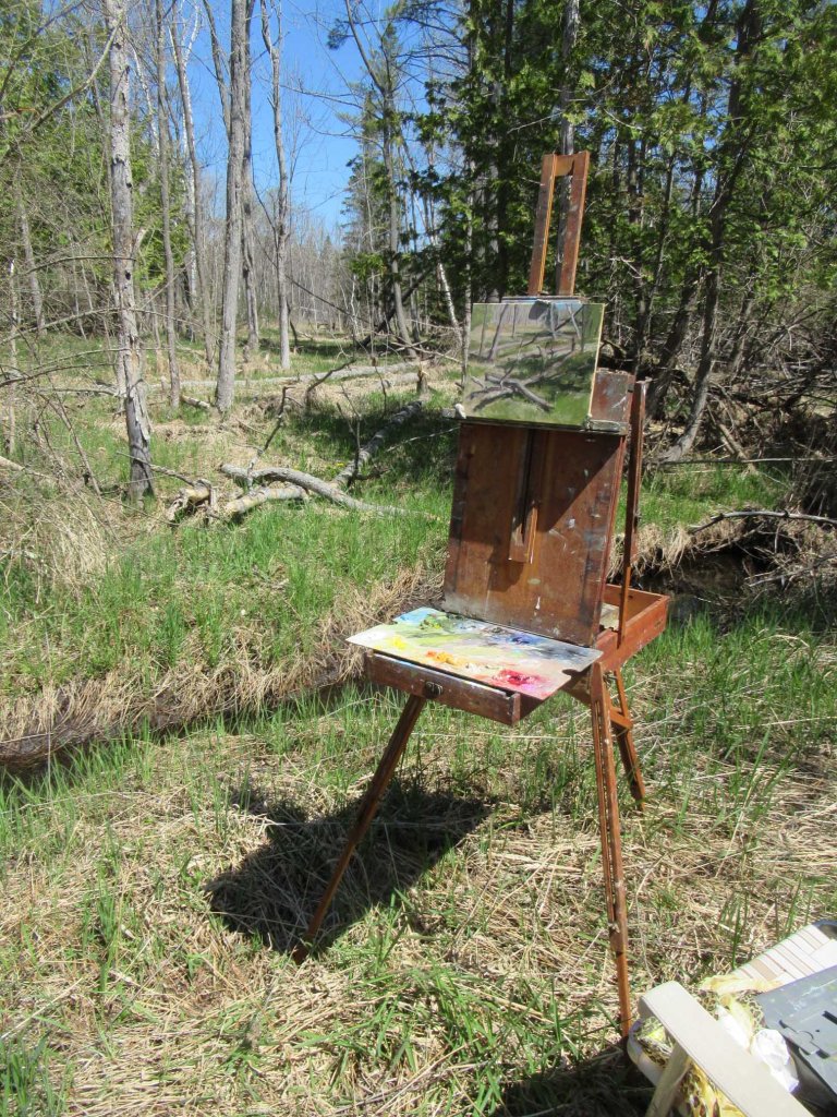 My setup this afternoon. After months and months of dark, winter gloom, it was blue sky and sunny all day. How could I not go painting? And I just had to paint some of the piles of fallen trees here. The big ice storm of northern Michigan wasn’t too bad right here, but I felt the urge to document some of it on my property.