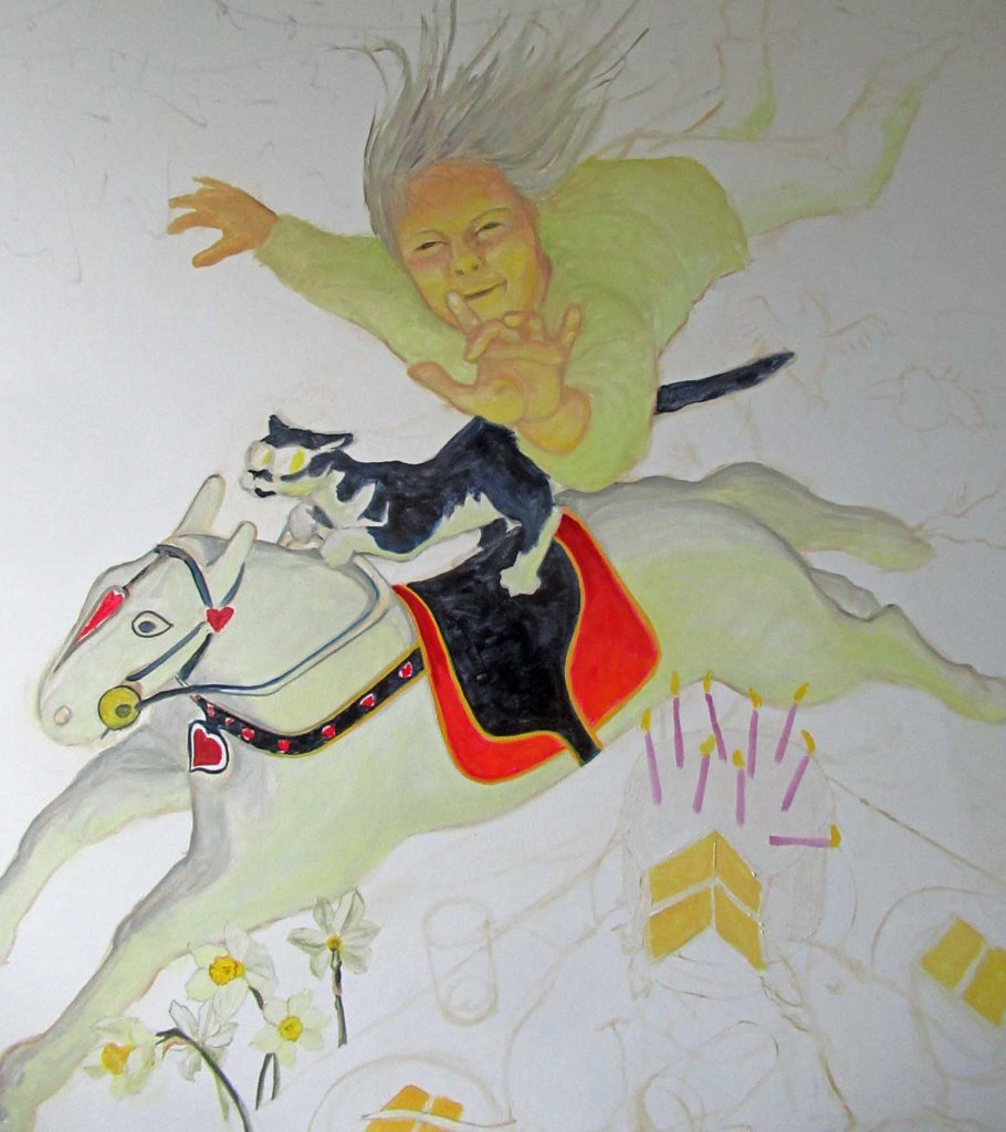 OK — looks pretty crazy, but there’s only so long I can toe-the-line, painting “nice” subjects: flowers, landscapes, etc. Making it up as I go along. I have high hopes…….
