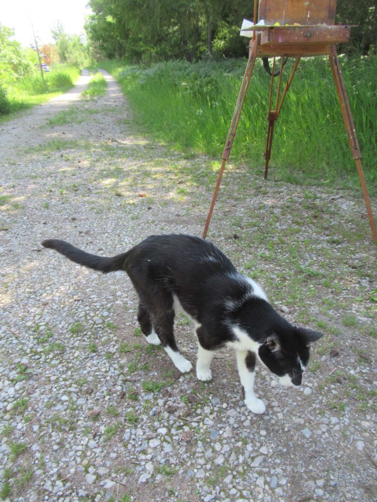 Last summer I’d hurt my back and everything in the yard kind of went to hell, so it’s been an extra amount of work this year. Then last week my cat had a run-in with a raccoon which aggravated his arthritic back. He’s feeling better now. He hung around me while I painted this afternoon.