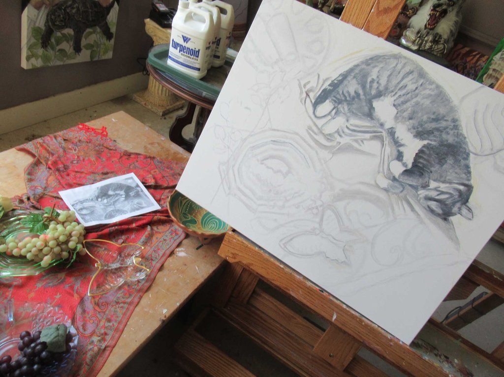 My 2 cats have a particular fondness for laying on top of my still life setups. Mr. Wonderful (the tabby) loves to rearrange things to his liking. Because we’ve had lots of rain storms here lately and the mosquitoes and deer flies are ravenous as hell, I decided it might be a good time to do another still life in the studio.