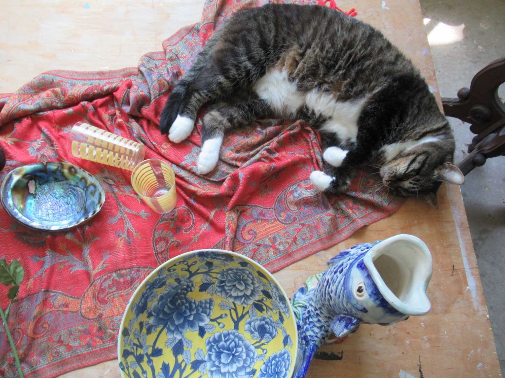 Just try to get a cat to hold a pose! Yesterday I snapped this of Mr. Wonderful (see photo below). Originally, that fabric was laid flat, with no wrinkles. Today I made a quick print to work from in black & white. Then it’s a process of trying to figure out what objects to add to get a certain “flow”. Stay tuned.