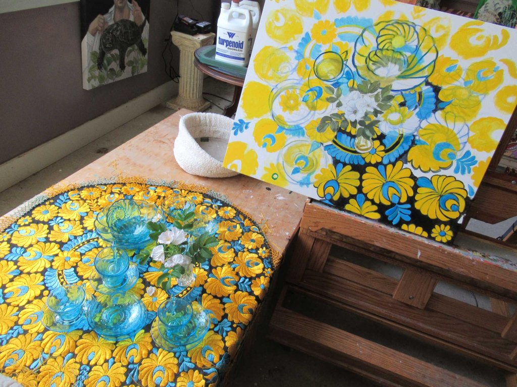 Yeah, it’s enough to drive a person berserk. Pretty challenging. At the possibly horrible/possibly wonderful stage. So we’ll see how it goes. I’ve taken a few breaks to go out into the swamp and plant native plants (hibiscus, swamp milkweed and joe pye weed). The first day I spent drawing in the lines of the glassware. Once dried, I felt daring enough to start putting in some of the embroidered parts. At first glance you’d think it was a simple matter of yellow and blue, but no…. The embroidery floss has a sheen to it, so there are highlights and darker spots. Then the yellow changes color when viewed through the blue glass. So — pulling weeds & planting flowers helps clear the mind.