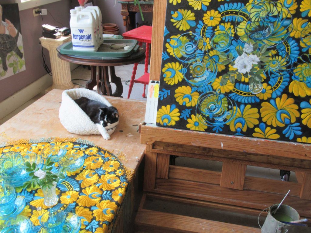 I spent all day working on the blue glass cups & plates as the smoke particulates from Canadian wildfires drifted in. For entertainment I stepped outside to pull weeds. The cats kept me company. Still left to deal with are the embroidered patterns, mostly on the left side. Oy vey! This fabric will not be painted again!