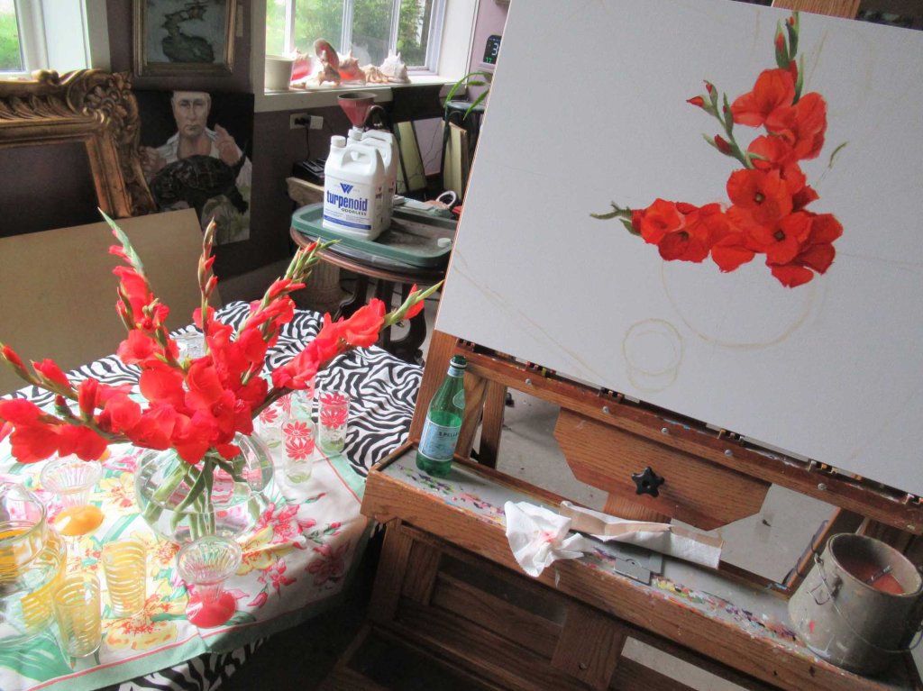 My friend Lucy called yesterday, telling me “the glads are in!” Thank goodness for that — I was getting sick and tired of green landscapes. So tired that I didn’t post the last two I’d painted. I flew over to the grocery store in Central Lake and snatched the brightest, reddest gladiolas they had. Red and orange are my most favorite colors.