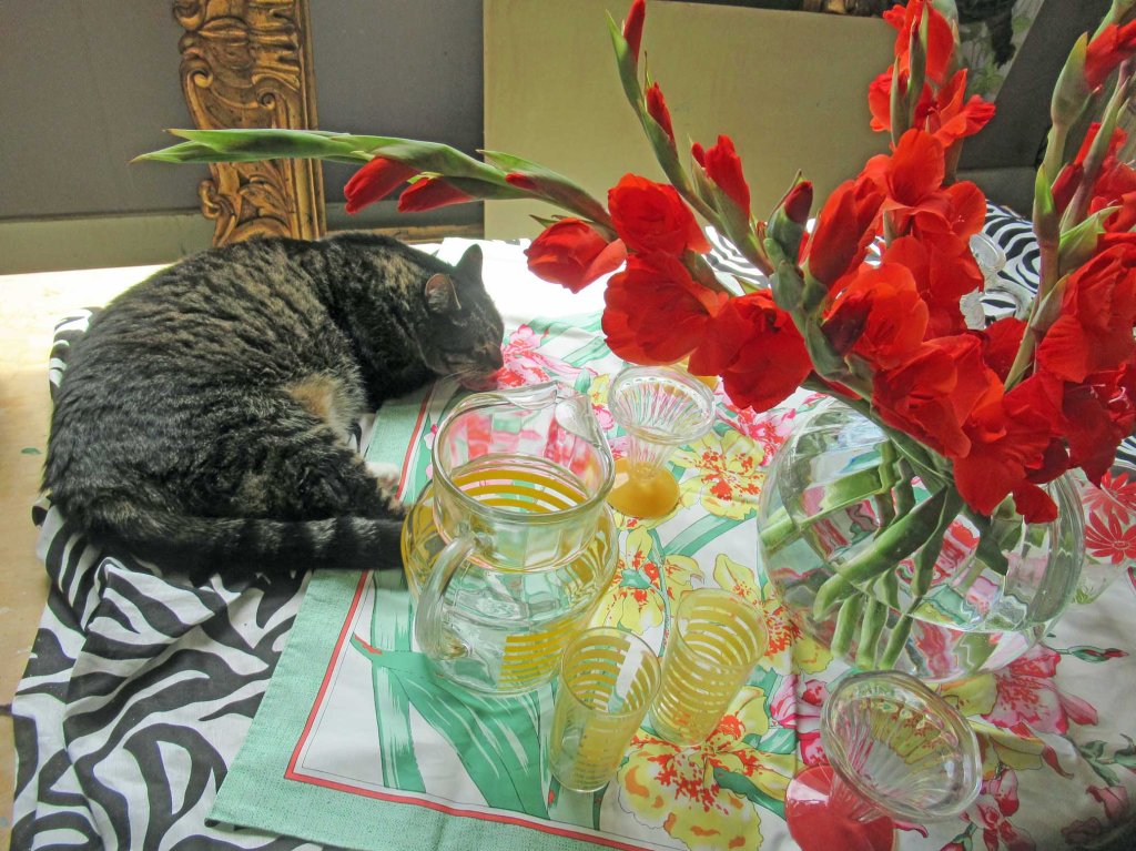 This morning I set up a still life and of course that drew Mr. Wonderful into the studio right away. Did he want his plush, cozy cat “nest”? Oh, nooooo! He lounged all day, snoozing on top of my setup. He only stirred to beg for more cat cookies.