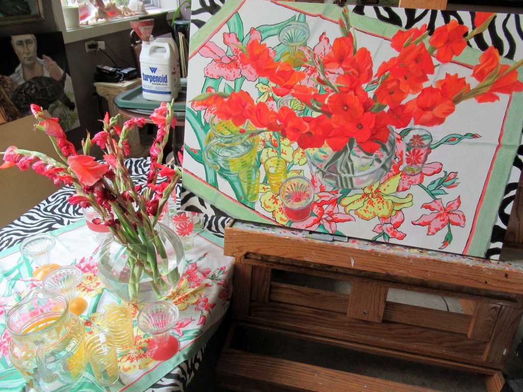 What’s a struggle is trying to finish a still life that looks nothing at all like it did when you started it. I managed to keep the cats from rearranging it, but the major component — the gladiolas — has completely turned to toast. So now I’m trying to envision what to do with the glasses, etc.