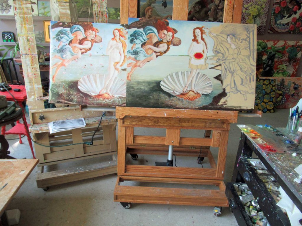 Day 4 here on this one. The easel on the right is a custom-made one by my artist friend Bob Perrish. Motorized! Has saved a lot of cussing. With the flick of a switch I can easily raise or lower it. What’s next? A battery-powered plein air easel? We need that!