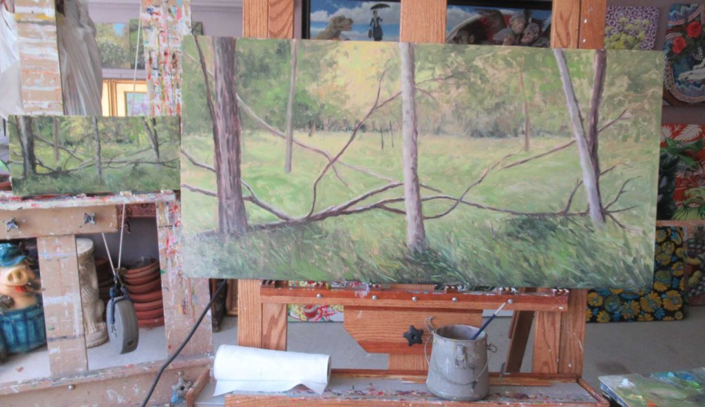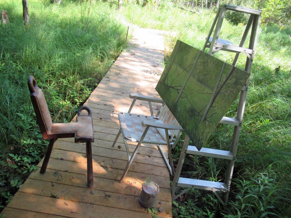 Yep — that’s a stepladder, a lawn chair and an antique birthing chair. I wanted to do a very large plein air painting in the swamp. None of my “regular” plein air easels were big enough to hold a 24×48″ painting, so this is what I rigged up. I wouldn’t recommend it for a very windy day, however!