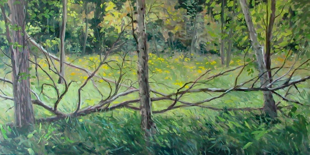 “Late Afternoon — Goldenrods in the Swamp” — oil on board 24×48″ by Margie Guyot
