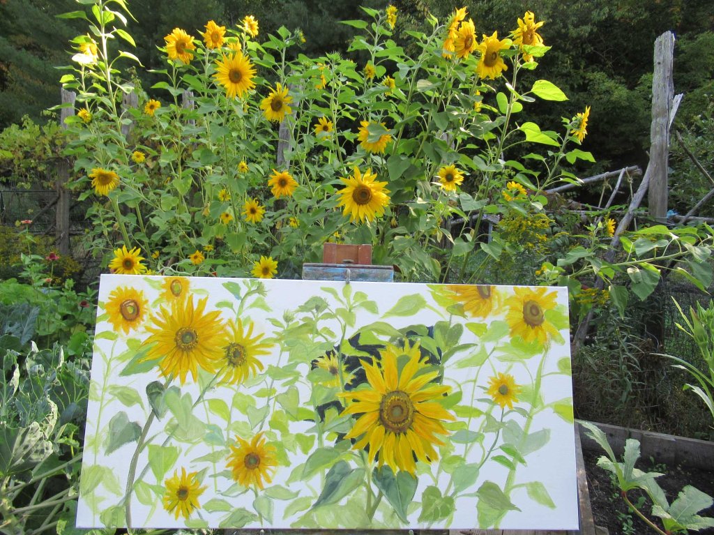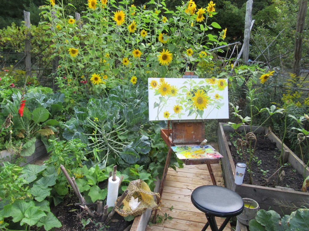 Here’s my setup out in the veggie garden. I start painting about 8:30 AM, while the sun is still rising over the ridge. By 10:30 everything’s transformed into bright sunlight — and time for me to quit and do yardwork, housework, play with the cats, etc.