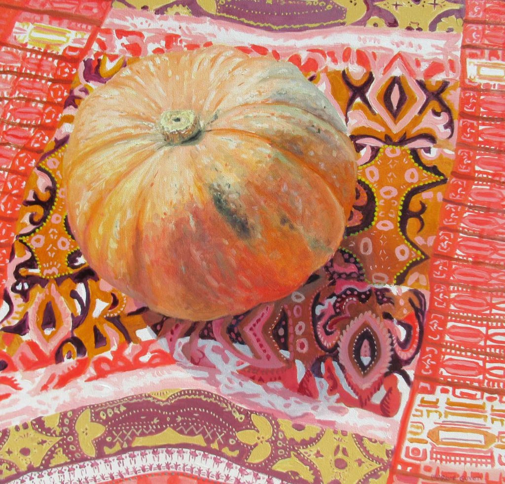 A few weeks ago I found this pumpkin at the grocery store and thought it was so pretty I painted it twice. I’ll save some of the seeds and try planting them here next spring. And the deer will enjoy a special treat. The most difficult thing about painting still lifes is keeping my cats from laying all over them and rearranging!