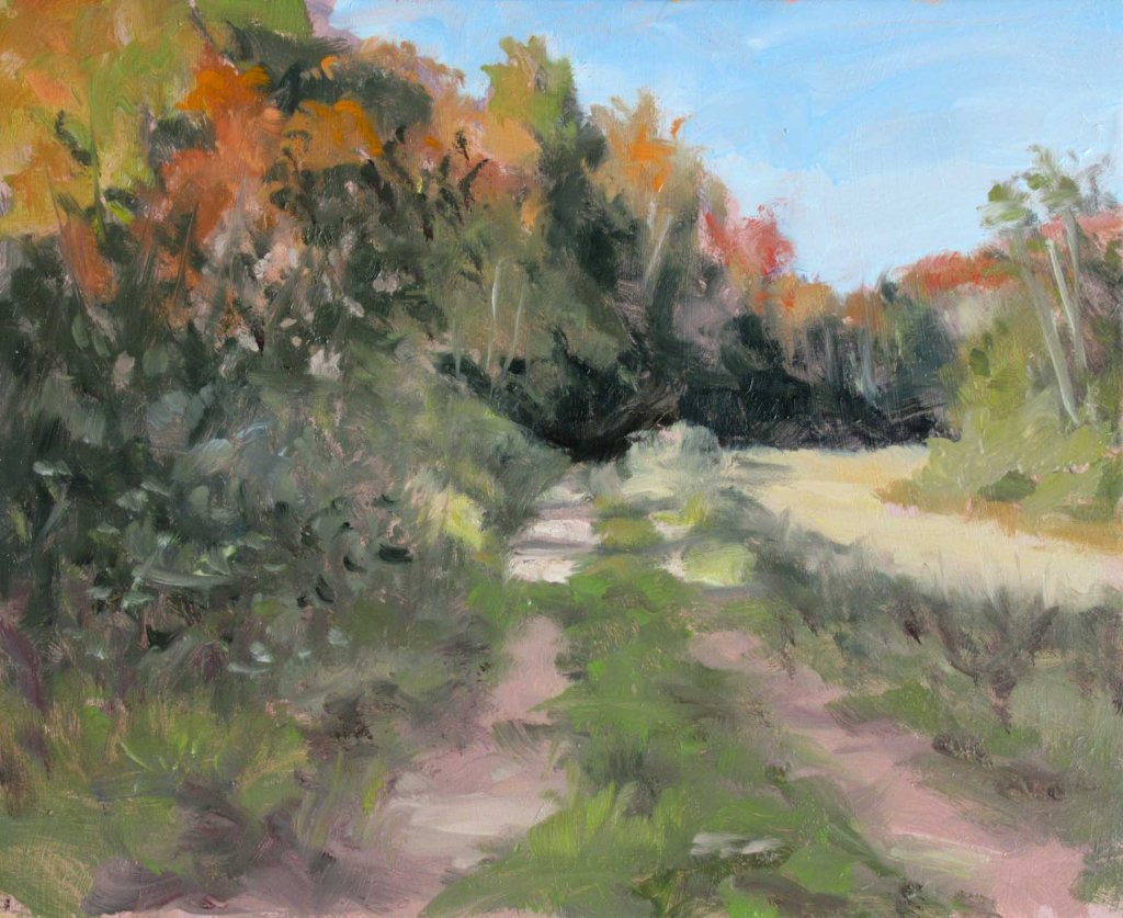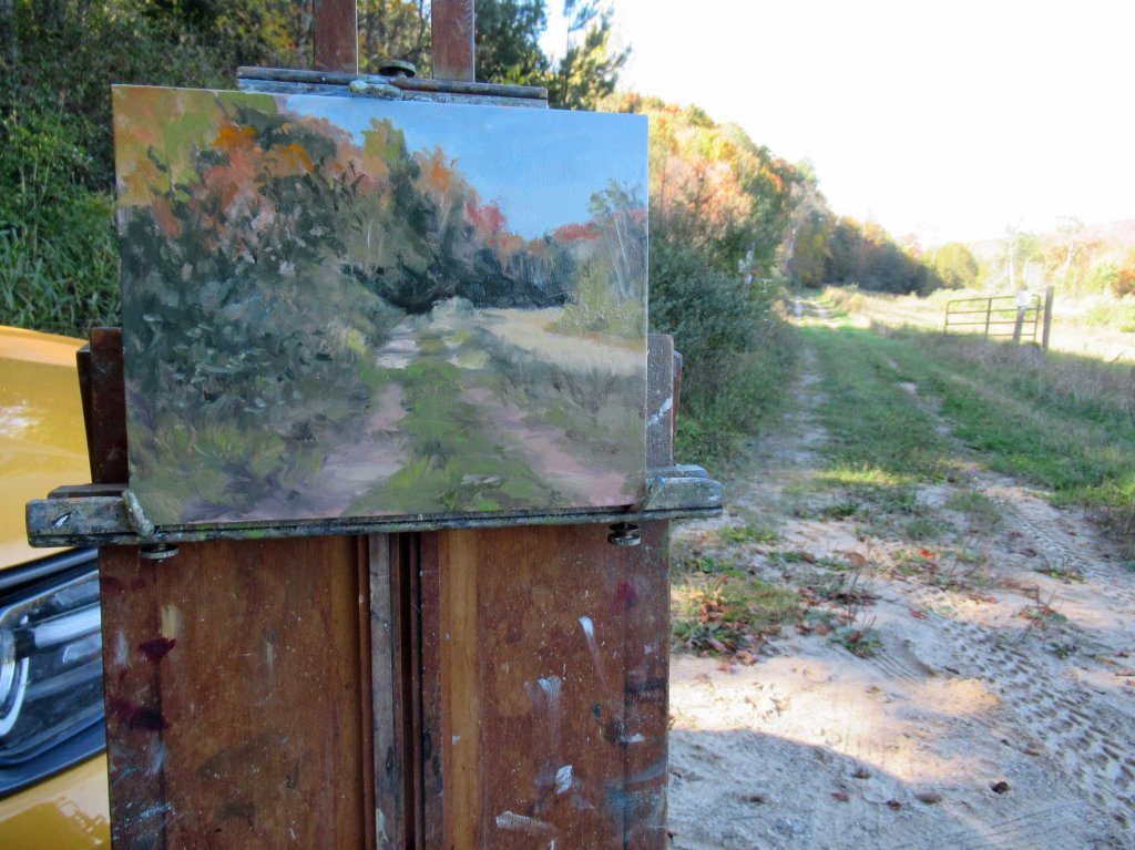 The sky cooperated briefly today and the clouds parted long enough for me to squeek in a painting. Some of you might recognize this scene. It’s one of my favorite spots. And yeaaaaay! The beautiful fall colors are starting to show.