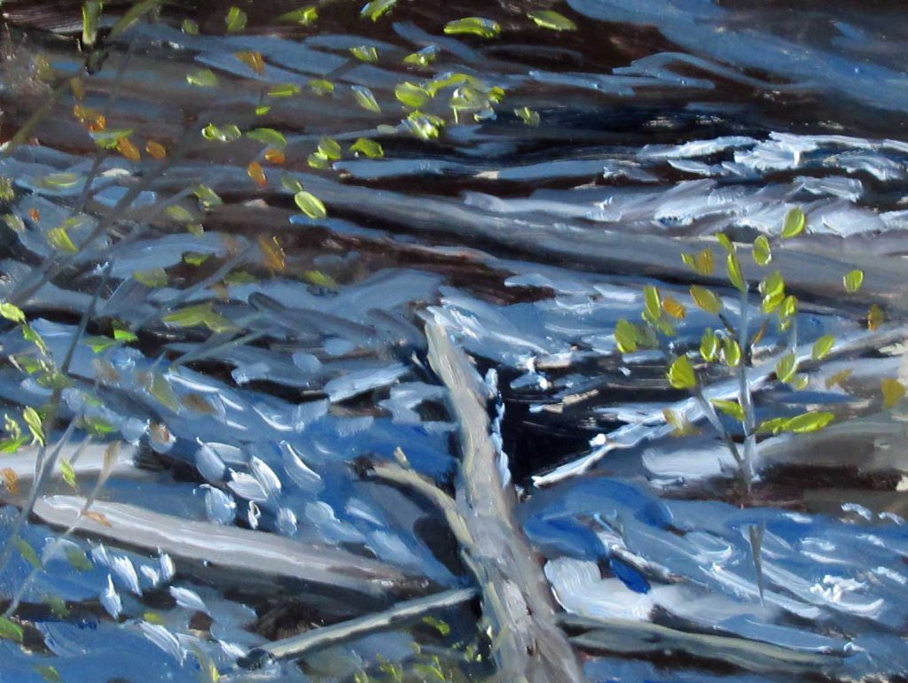 I was determined to paint something, doggone it! So that was my mental state when I found this spot. I think it reflected the massive struggles I’d encountered that day: the extreme darks, rushing water, little flickers of light (is there hope? will I be able to get online with the new computer? will the lawyer be able to handle things?)…..