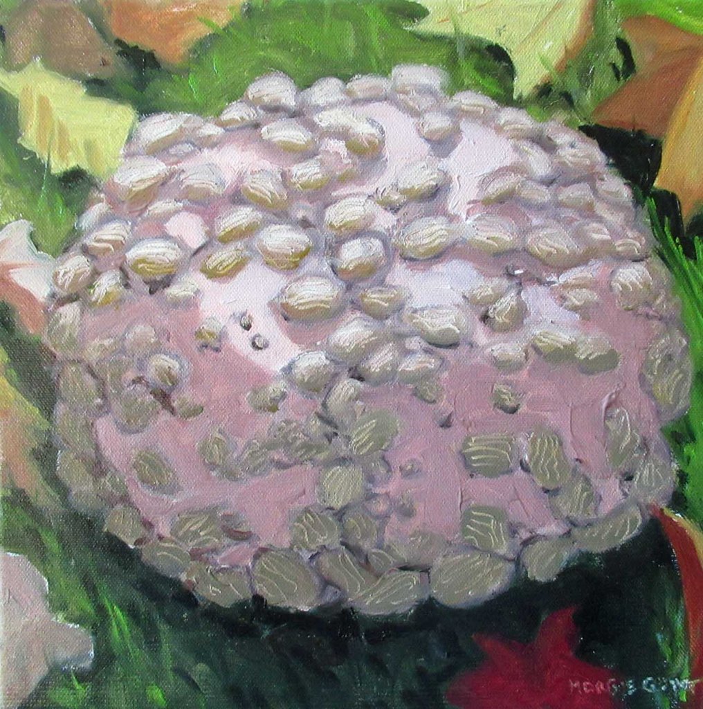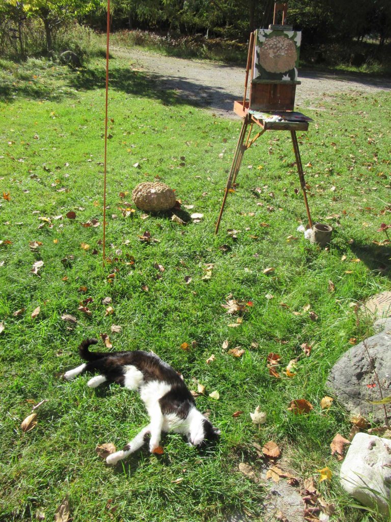 A beautiful day here! I decided to paint a big peanut pumpkin (a.k.a. “Galeux D’Eysines” for you purists) out in front of the studio. Picasso, my wonderful cat, was helping.