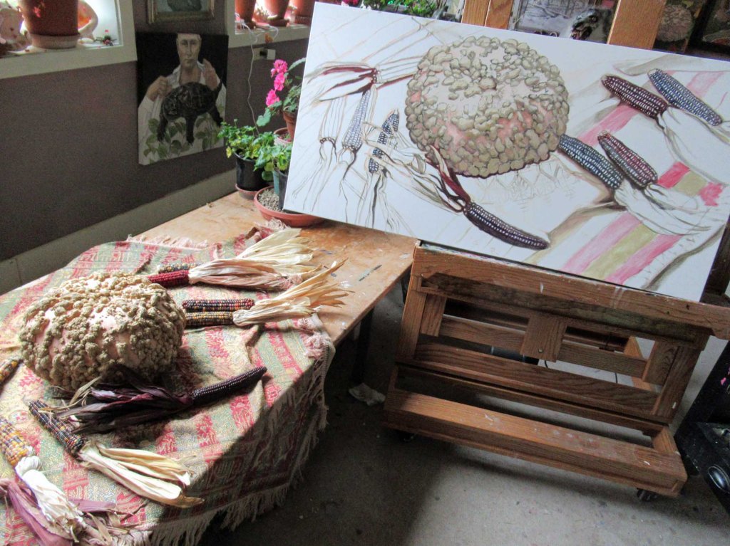 Can you tell I’m fascinated by that pumpkin? Yesterday I set up a still life with some Indian corn and an ancient tapestry of some sort. This is what it looks like at the end of Day 2 (above). Day 1 was nothing all that special (below). I’m using a 24×48″ canvas. I took extra care to measure things out and get them drawn in carefully. That fabric is going to be a challenge, but I always say that.